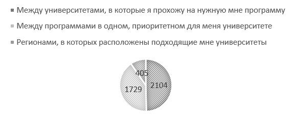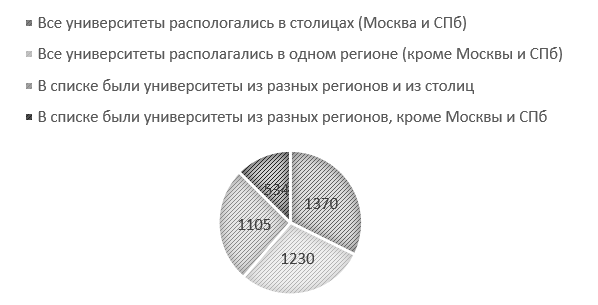 На рисунке 3 отражена структура ответов респондентов на вопрос «Университеты, в которые Вы подавали заявление, были расположены в разных регионах или в одном?».