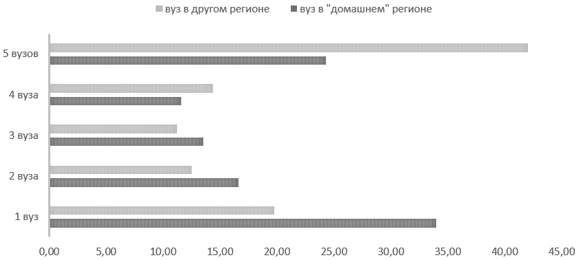 Рисунок 2 – Распределение числа вузов, в которые подавали заявления респонденты, по типу образовательной миграции (% от числа респондентов внутри каждой группы по типу образовательной миграции)
