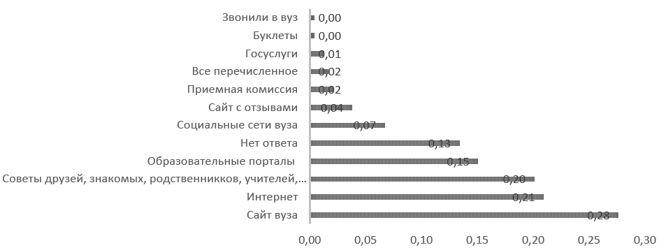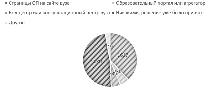 Выдвинута гипотеза о том, что в связи с цифровизацией процесса поступления меняются сценарии визита абитуриентов в университет на этапе «сделка» обратной воронки маркетинга: из места подачи документов приемная комиссия превращается в место личного знакомства с вузом и принятия итогового решения. Также следует отметить, что в графе «другое» респонденты часто указывали «все варианты» или перечисляли свои варианты через запятую. Это говорит о том, что абитуриенты сравнивают информацию в разных источниках, и актуализирует вопрос о цифровом бренде университета в совокупности внешних и собственных цифровых медиа. Наиболее частотное сочетание ответов: советы друзей и отзывы в интернете, рейтинги вуза и отзывы.