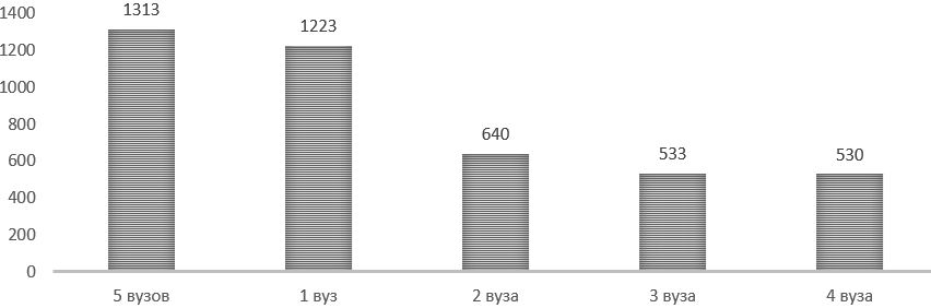 Рисунок 1— Число вузов, в которые подавали заявление респонденты (количество респондентов, чел.)