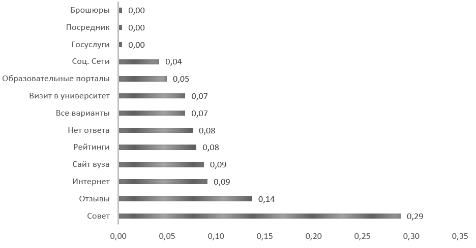 Рисунок 14 – Частотное распределение ответов респондентов в графе «другое» на вопрос «Когда Вы делали выбор между университетами, в которые проходили, на какие источники информации полагались?», доли ед.