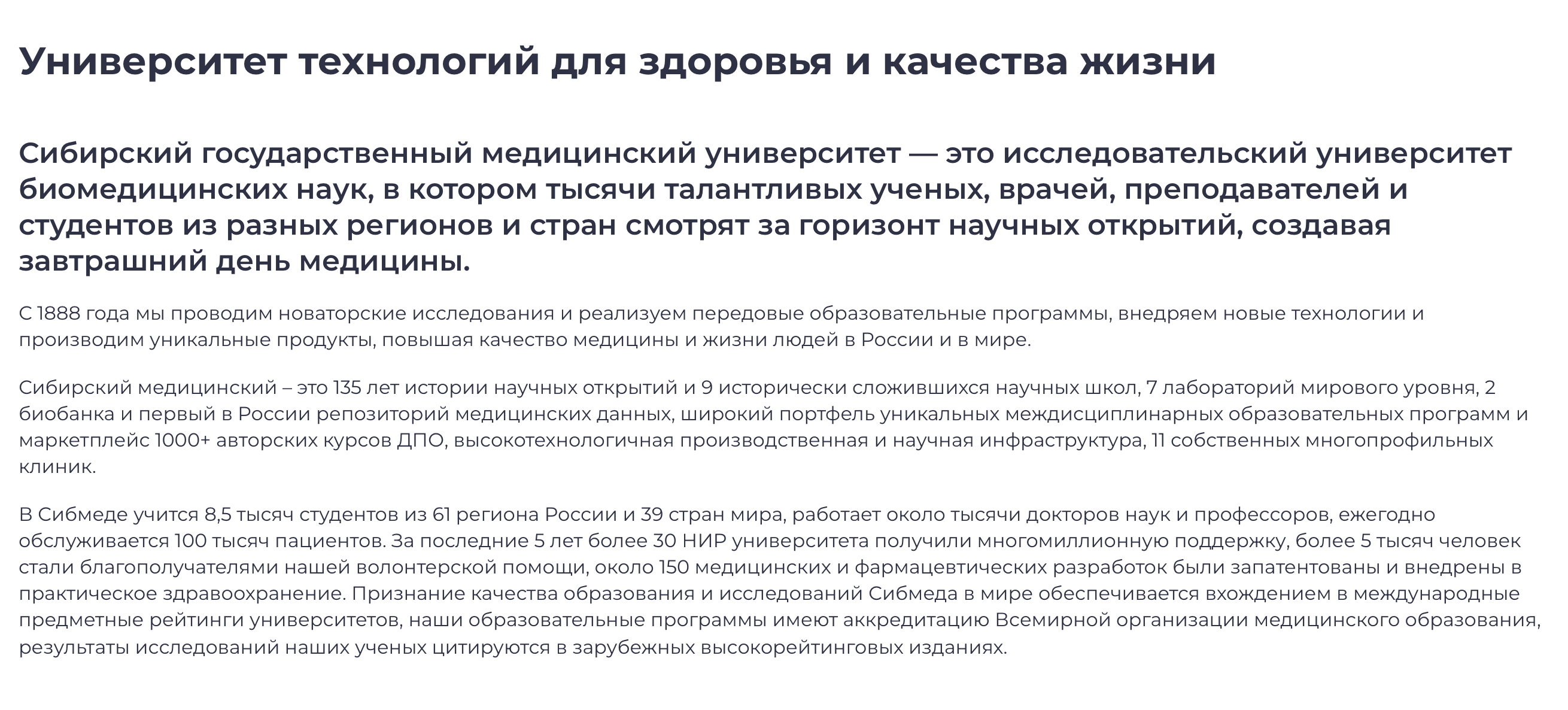 Руководствуясь подходами к разработке платформ бренда ведущих зарубежных университетов, мы сделали отдельный раздел с месседжами по направлениям деятельности, то есть сформулировали обещание бренда, миссию, позиционирующее определение и преимущества (причины выбрать) отдельно для абитуриентов и студентов, ученых, партнеров и зарубежного академического сообщества. Мы ответили на вопросы: «Как через образовательную, научную, экспертную и международную деятельность университет реализует свою ключевую идею?». Мы также выделили ключевые научные направления, области экспертизы и экспортной специализации на стыке сильных сторон университета, слабых сторон конкурентов и вызовов национальной и мировой повестки – фокус на их позиционировании позволит сыграть на эффекте «ореола положительного».